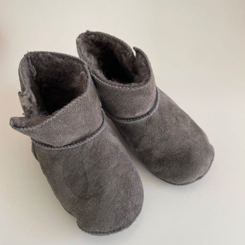 Der er et lille hul i sålen, men det er ikke udendørssko. De er vist mest til at holde barnets fødder varme i klapvognen eller barnevognen, og der har det lile hul ingen betydning. dejlig varme. De kan også stå til pynt. De er virkelig virkelig søde. 50 kr.