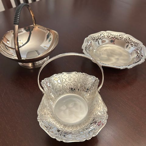 Sølvtøj, Skål/kurv med hank i sølvplet, Fin kurv/skål med hank i sølvplet fra 1980'erne. Sender gerne, køber betaler porto.