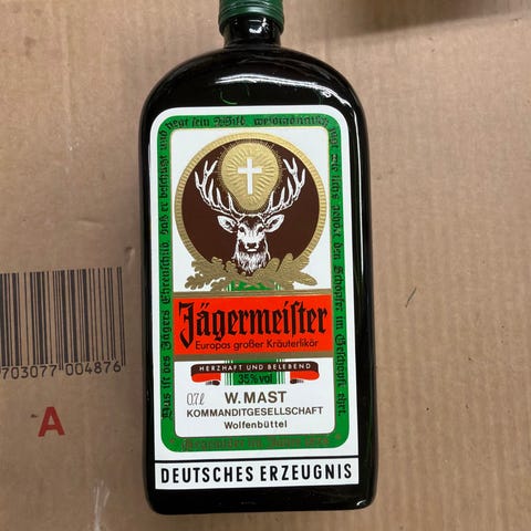 Jägermeister matal beholder til en 0,7 liters flaske. Mørk farve med karakteristisk etiket.