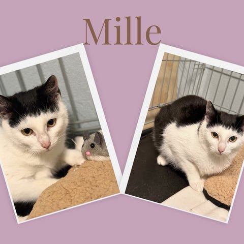 Mille er en stor killing på omkring 8 måneder, som i starten er lidt forsigtig og skal have lov til at falde til i sit eget tempo. Hun kommer ikke løbende i møde, men giver man hende lidt tid, viser hun sig som en utrolig hengiven og kærlig hunkat, der nyder nærhed og menneskelig kontakt.