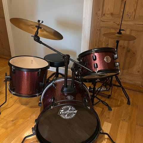 Ludwig Pocket Kit. Et virkelig godt junior-trommesæt med næsten nye remo-skind på tammerne. Det lyder godt og står virkelig flot med red sparkle og solide sortmalede stativer.