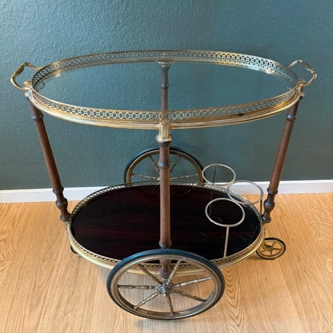 Søgeord: Serveringsvogn, glas, bar vogn, rullebord, rullevogn, guld, messing, vintage, patineret, gammel, antik, barbord, gaven til manden / kvinden, julegave, fødselsdagsgave.