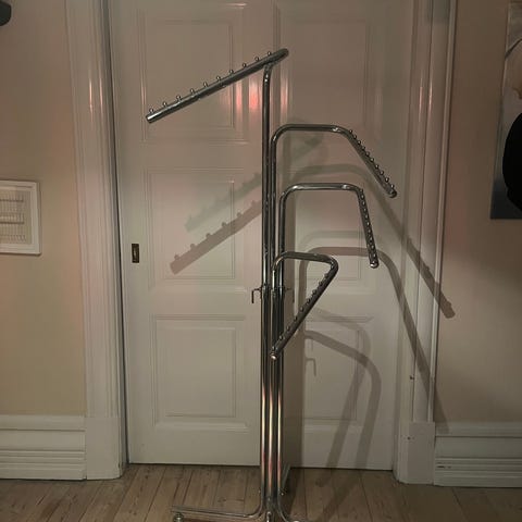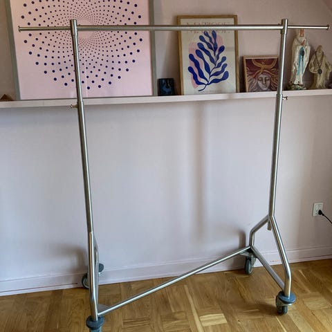 Lækkert tøjstativ af stålrør 150 bredde, 50 dybt, 200 højt, med 2 stænger. Fejler intet, skal sælges på grund af flytning til mindre plads desværre. Nypris 1650
