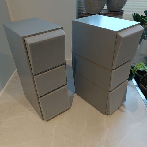 Bose højtalere i hvid farve. Består af to separate enheder med stofbeklædte frontpaneler. Designet til at levere lydoutput til lydsystemer.