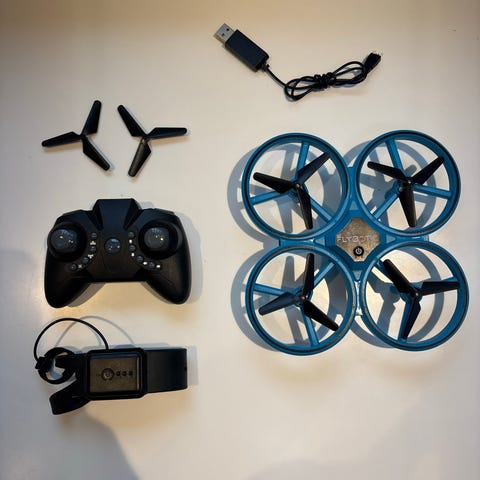 Flybotic Superdrone drone i blå farve. Udstyret med bump & bounce beskyttelsesring, tre pilot hastigheder, headless mode, og auto hovering funktion. Kan flyve op, ned, til højre, venstre, fremad, bagud og sidelæns. Designet til indendørs og udendørs brug med en rækkevidde på over 30 meter. Egnet til børn fra 8 år og opefter.