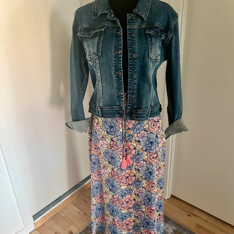 Flot sæt med små glimrende sten på Jakke og bukser, jakke går lige til taljen med to side lommer str.M