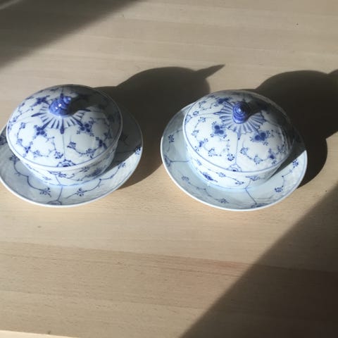 Smørkrukke med fast underskål. Underskålen 17,5 cm diameter