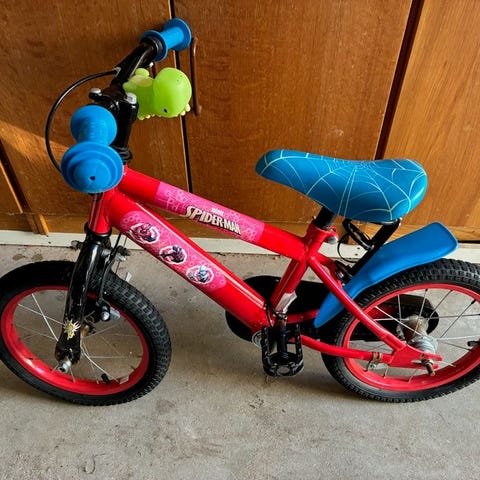 Den har 12" hjul og et gennemført Spider-Man-tema på stel, skærme og saddel.