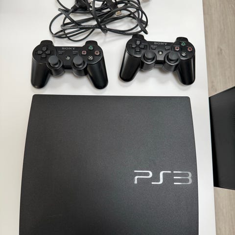 Sony PlayStation 3 spilkonsol i sort farve. Inkluderer tilhørende kabler og en sort controller. Enhed til hjemmeunderholdning med mulighed for at spille forskellige spil.
