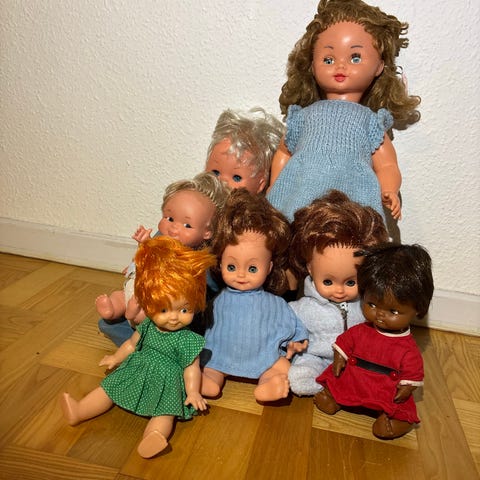 5 gamle dukker med strikkede outfits. 4 af dem har vippeøjne