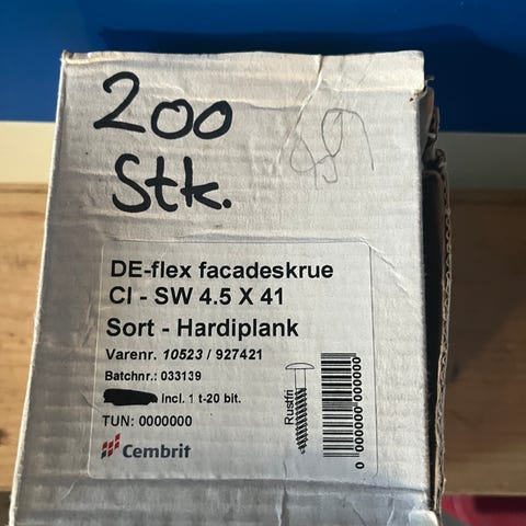 Rustfaste skruer til montering af facabeklædning på træ, f.eks. fibercement/eternitplader, Hardieplank, Ivarplank og Cembrit / Swisspearl planker / plader.