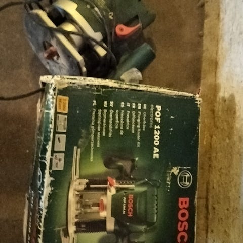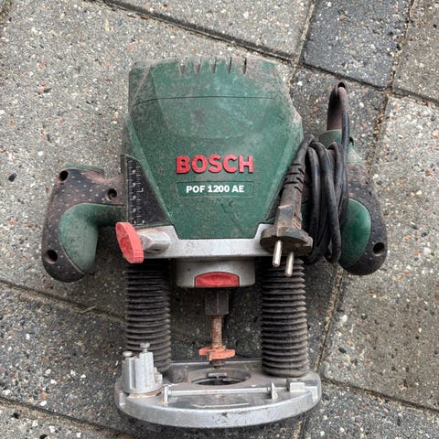 Bosch POF 1200 AE fræser med elektronisk hastighedsregulering. Den leveres med tilbehør som dybdestop, land og støvudsugningsadapter.