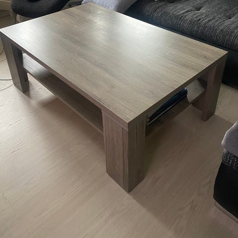 Klassisk Ikea sofabord med fyrretræsmønster. Avishylde på skinner under bordpladen