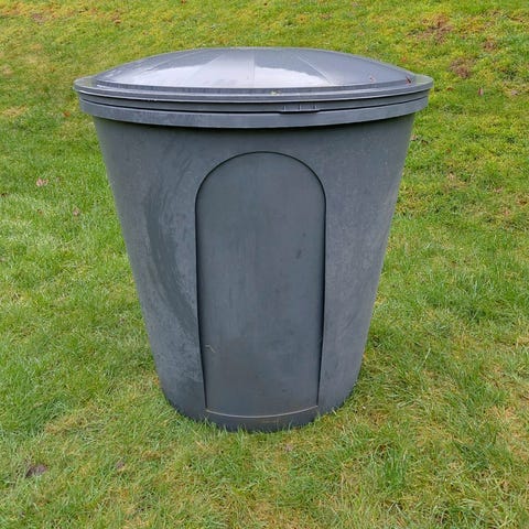 • Beskrivelse: Andehuset er lavet af to runde mørkegrå regnvandstønder i plastik.