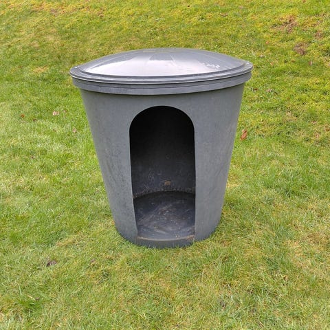 • Beskrivelse: Andehuset er lavet af to runde mørkegrå regnvandstønder i plastik.