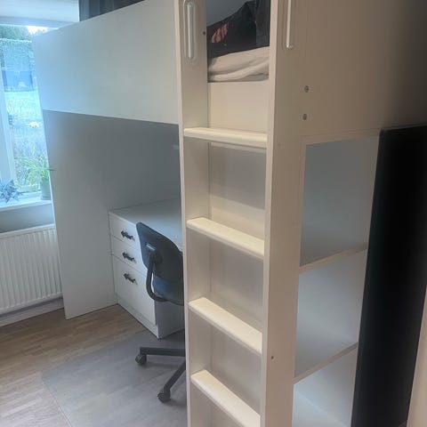 Der er desværre et hak i beklædning over sengen (se billede 5, 10 under plastikplanten til højre). Derfor prisen. Sengen er skilt ad, så den er lige til at transportere. Højsengen inkl bord er rengjort og klistermærker er fjernet. Se sidste billede.