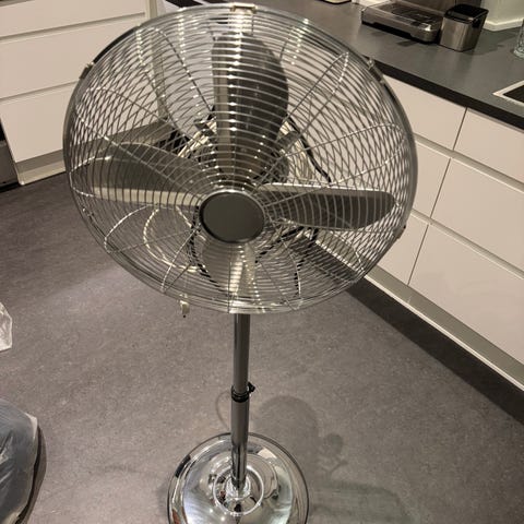 "Gammeldags" ventilator med trefod. Ventilatoren har et justerbart stativ i træ, og et ventilatorhoved i metal, som kan dreje automatisk.
