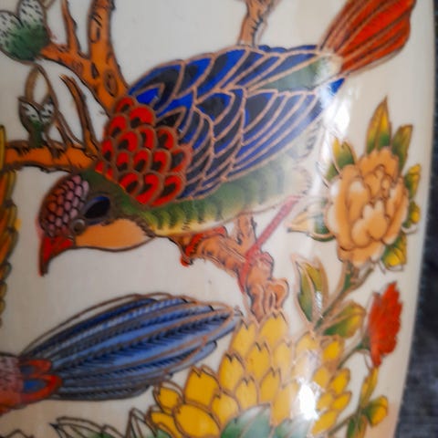 På grund af flytning sælger vi vores næsten helt ny kinesisk dekorative gulvvase med et meget flot mønster (blomster og fugle) Vasen blev slet ikke brugt på grund af mangel på plads, men stod bare i opbevarede rum. Vasens højde er 61cm og øverste diameter er 17 cm. Der er to slags mønster overalt: to med fugle og to med blomster Den fejler ikke noget!!! Vi sender ikke og modtager KUN kontanter