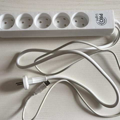 PowerCube USB Udvidelsestræk med 4 stikudtag og 2 USB-porte. Enheden har en rund form og hvid med grønne detaljer. Designet til at udvide antallet af tilgængelige strømudtag og USB-porte til opladning af elektroniske enheder.