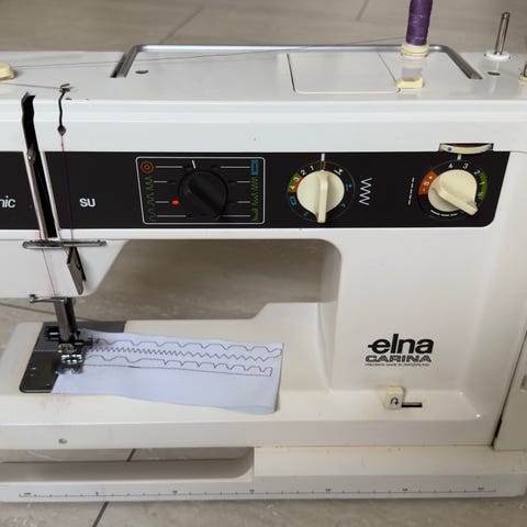 Elnita 1006 symaskine med flere sømindstillinger. Maskinen er hvid med grå og blå detaljer og har en manuel betjening. Velegnet til forskellige syprojekter. Jeg sælger den fordi jeg kan ikke finde ud er det at bruge maskinen