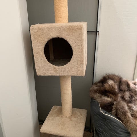 Beige kattekradsetræ med flere niveauer, inklusive huler, platforme, hængekøje og legetøj. Materiale: beklædt med blødt stof og kradsesøjler. Designet til katte til leg, klatring og hvile.