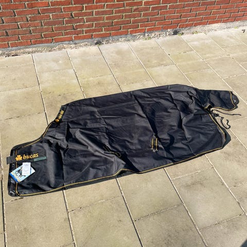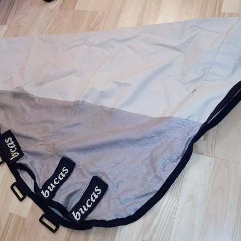 Bucas Irish Turnout Light 50 gram str. 130. Købt for 3 år siden men kun brugt ca 3 måneder. Det har ingen huller og er helt vandtæt, men har mudder efter brug. Halestroppen mangler, men der er ringe til fastsættelse af ny.