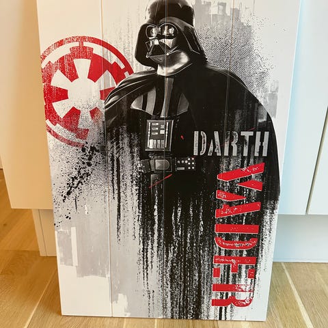Fin R2D2 displate til væggen med gloss overflade. Lavet i tynd metal og hænges op med magnet (medfølger) og dobbeltklæbende tape. Den har et lille skrab på kanten af pladen, det går ikke ned på motivet - se sidste billede. Kan evt fikses med en tusch (ej forsøgt)