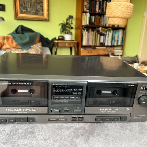 JVC TD-W304 stereo kassettebåndoptager med dobbelt kassetteafspiller og optagefunktion. Enheden har analoge knapper og et display til styring af båndafspilning og optagelse. Tilslutninger inkluderer RCA-indgange og -udgange. Enheden er sort og er designet til hjemmebrug til afspilning og optagelse af kassettebånd.