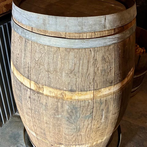 Halv vintønde fyldt med mange brugte vinpropper. Tønden er lavet af træ med metalbånd rundt om for stabilitet. Kan anvendes til opbevaring eller dekoration. Tønden måler ca. 48x68 cm. og er ca. halvfyldt med vinpropper.