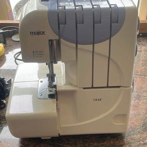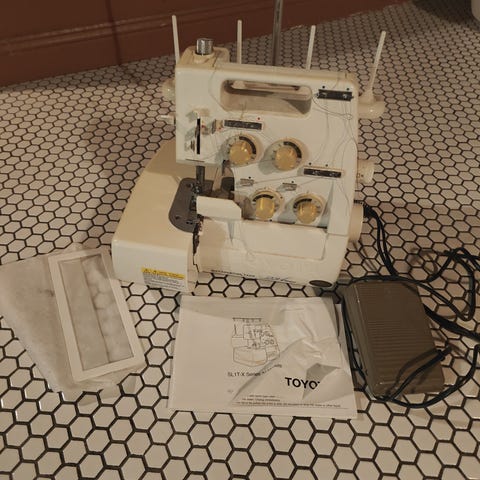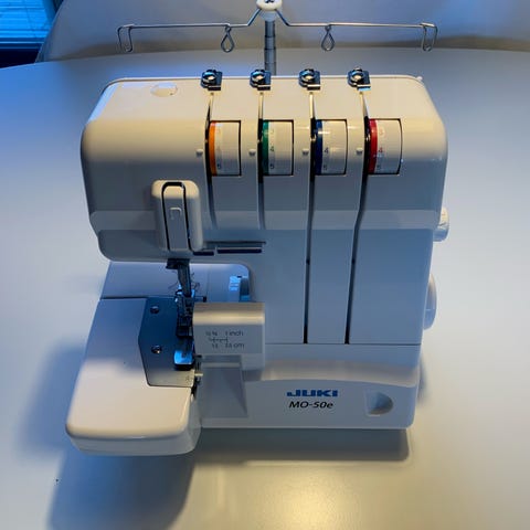 Toyota SLR4D overlock symaskine med fire tråde. Maskinen er designet til at sy og afslutte kanter på stof, hvilket giver en professionel finish. Den har en kompakt størrelse og leveres med tilbehør og original emballage.