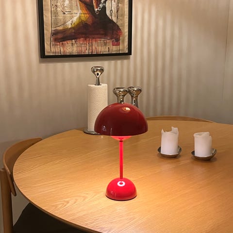 Der er 3-trins lysdæmper på lampen, som justeres nemt ved at holde fingeren på toppen af lampen. Lampen oplades nemt via det medfølgende micro USB opladningskabel. På fuld opladning kan lampen lyse i op til 11 timer.