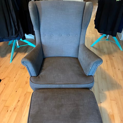 Stolen har nogle mørke pletter på armlænene, men kan sikkert fjernes med textilrens.