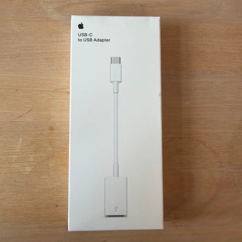 Apple adaptere tilslutningskabel med USB-C-stik og USB-A-port. Designet til at forbinde USB-C-enheder til USB-A-tilbehør. Farve: hvid. Materiale: plastik og metal.