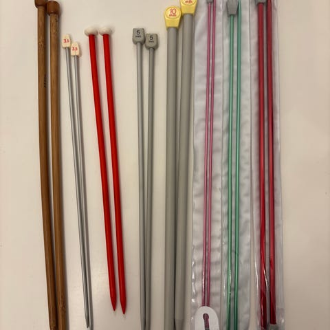 Diverse strikkepinde sæt med forskellige størrelser. Sættet indeholder forskellige typer strikkepinde i forskellige materialer og farver, opbevaret i en pink floral stofrulle med lommer. Egnet til strikkeprojekter med varierende pindetykkelser.