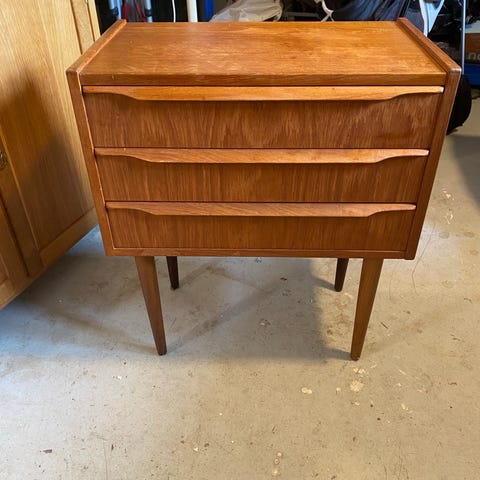 Sød teaktræs kommode med 5 skuffer og flotte greb.