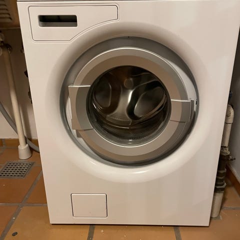 Asko Frontbetjent vaskemaskine med frontbetjent design. Maskinen er hvid og har en rummelig tromle i rustfrit stål. Sælges fordi vi har to.
