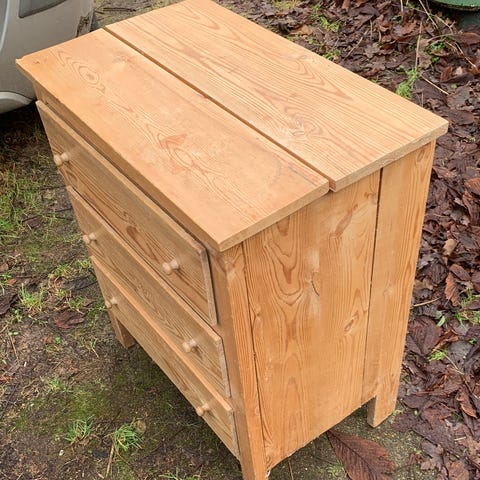 Måler ca. 68 x 39 x 67 cm. Dette er en antik eller vintage fyrretræskommode, med fire skuffer, Møblet er fremstillet af lyst fyrretræ, som ofte omtales som afsyret fyrretræ, hvilket er en populær stilart for ældre møbler.