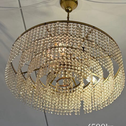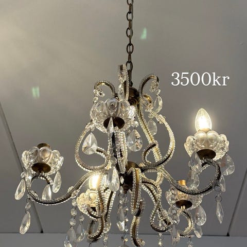 Super flot lysekrone med rosa prismer. Pærer medfølger. Ca 50 cm i dia og ca 40 cm høj. Mangler enkelte prismer men det ses ikke.
