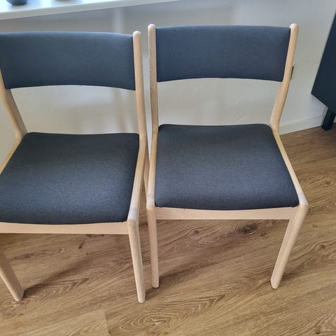 Flotte og velholdte med høj ryg og flettet egetræ. Med nyt betræk i mørkegrå. Fra dyre-og røgfrit hjem. Sælges helst samlet, eller 4 stk. samlet pris. 4500. Nypris 16.000. Giv evt. et bud.