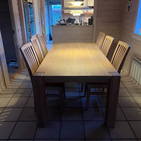 Pænt spisemøbel sæt, inkl 10 stole med sort betræk. Det sorte er ens på de 6 stole og med en meget lille variation på de 4 stole.