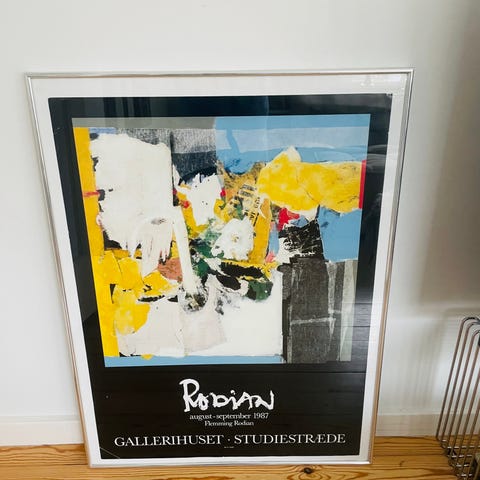 Auguste Rodin litografi kunsttryk med motiv af figurer i bevægelse. Trykket er nummereret 45/52 og signeret med initialer M.R. Farverne inkluderer blå, gul og brune nuancer. Kunsttrykket er indrammet og egnet til vægophæng. Måler B: 128 H: 110 cm.