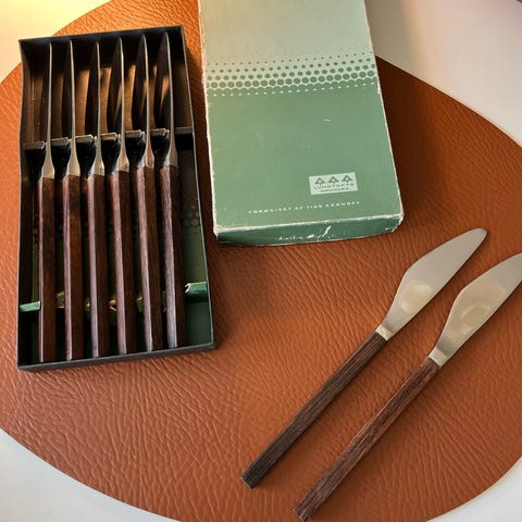 Jeg ved ikke om det er teak eller palisander. Gafler og to knive følger med gratis.