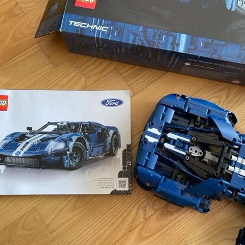 LEGO Technic Ford GT model i blå farve med hvide striber. Modellen er detaljeret og repræsenterer Ford GT sportsvogn. Inkluderer byggevejledning.