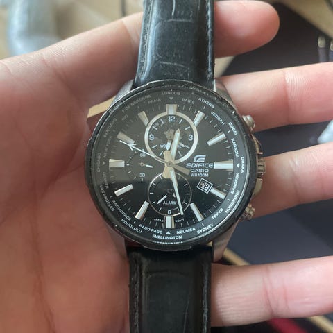 Casio Digital ur. Uret har en digital skærm og et metalarmbånd i guldfarve. Det viser tid og dato. Kan bæres at både mænd og kvinder. Uret er brugt som det ses på billederne