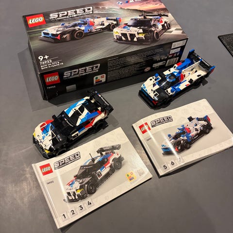 LEGO Speed Champions bil model med blå og hvide detaljer. Inkluderer en manual til samling. Egnet til samling eller leg.