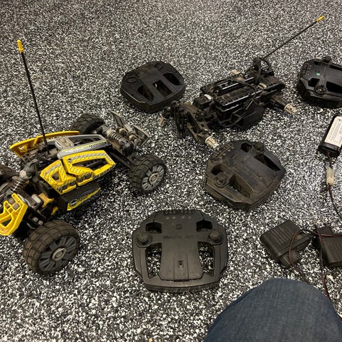 LEGO Technic fjernstyret bil i gul og sort farve. Modellen kan ombygges og har store hjul og antenner til fjernstyring. Designet til udendørs leg og teknisk byggeoplevelse.