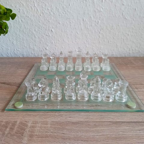 Flot skak spil hvor de to sæt brikker er udført i henholdsvis klart og mat glas.