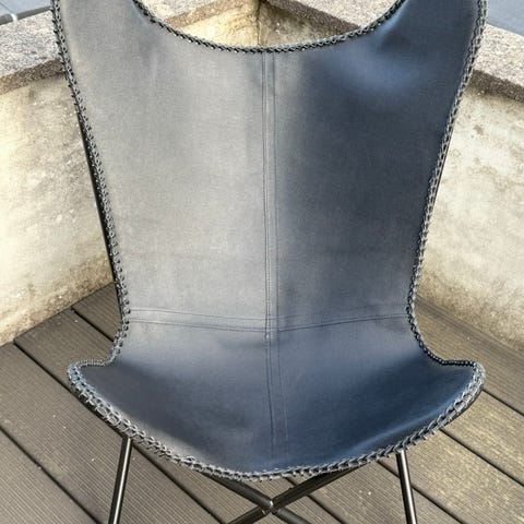 Flot Flagermusestol med sort læder og stel, som vi desværre ikke har plads til.