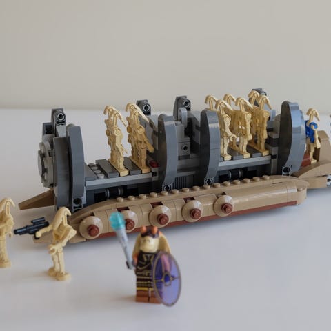 Det inkluderer fire minifigurer: Plo Koon, to Wolf Pack Clone Troopers og en Droideka.