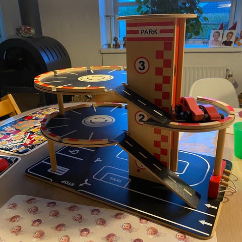 BRIO legetårn i plast med rød, grå og gul farve. Legetårnet har to etager, en spiralrutschebane og en helikopterlandingsplads på taget. Velegnet til børn til leg og fantasiudvikling. Sælges uden accessories.